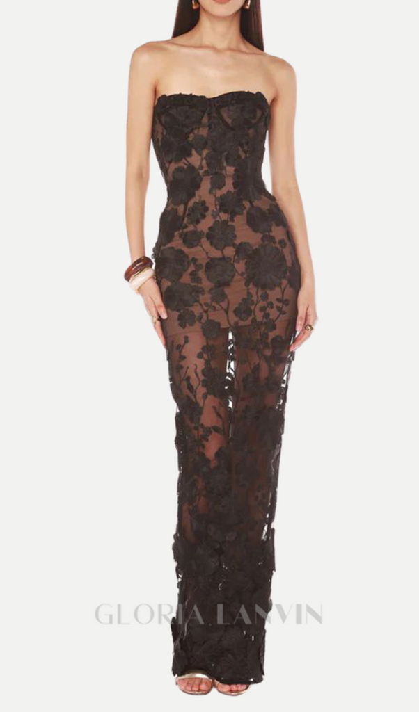 STRAPLESS FLORAL SEQUIN MAXI DRESS