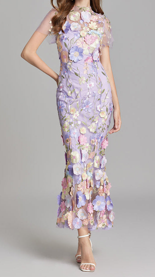 FLORAL EMBROIDERY MESH FISHTAIL MIDI DRESS IN PURPLE