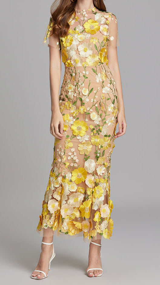 FLORAL EMBROIDERY MESH FISHTAIL MIDI DRESS IN YELLOW