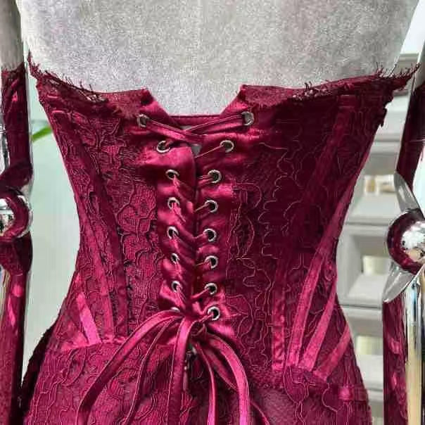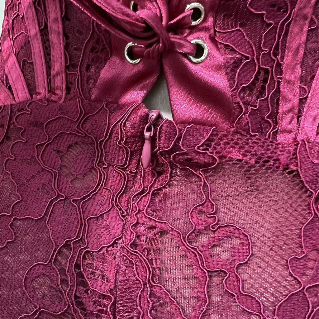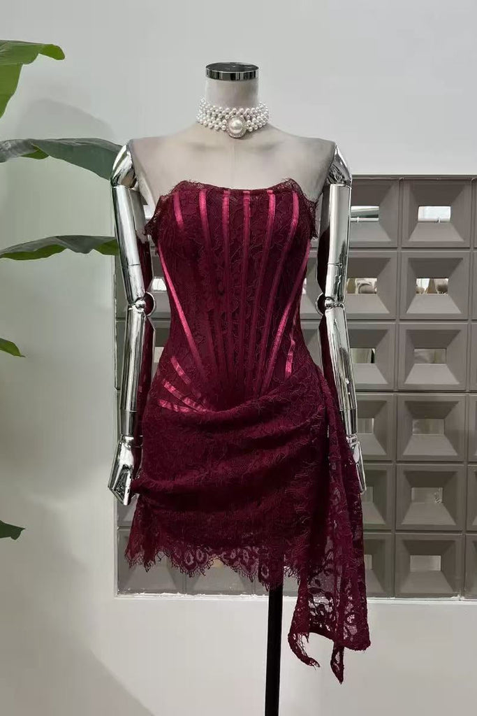 Elevate your evening look with this Burgundy Lace Overlay Bustier Mini Dress, expertly designed to enhance your silhouette. The fitted bustier provides structured support while delicate lace overlays add intricate texture and depth. Its mini length and rich burgundy hue create a sophisticated yet alluring aesthetic, perfect for formal events or special occasions. This dress combines elegant craftsmanship with a flattering fit to ensure you stand out with confidence and style.