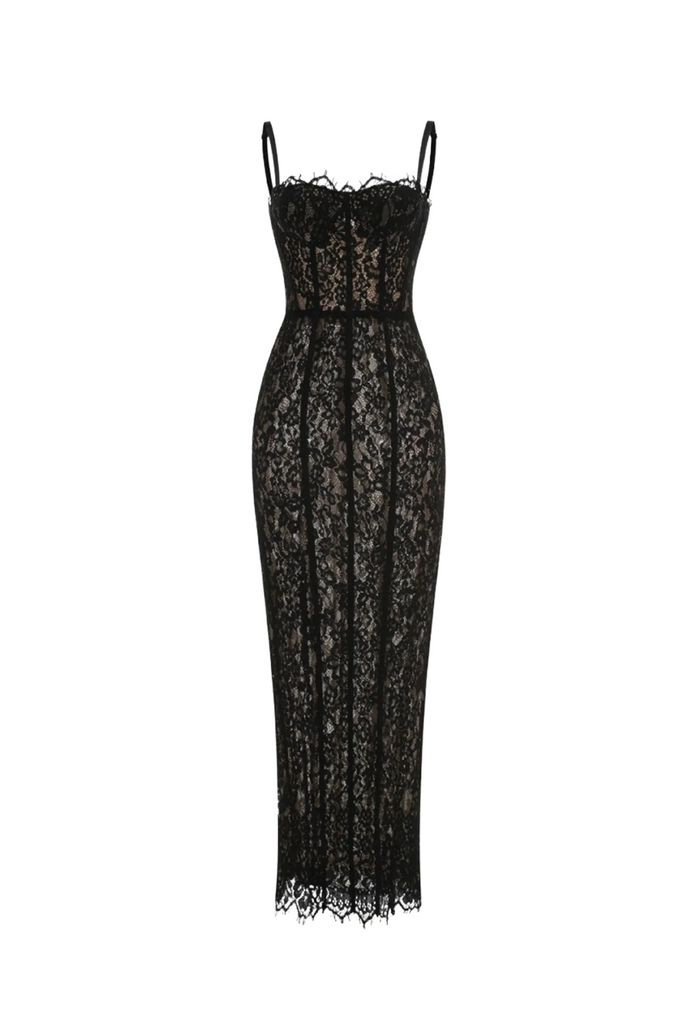 Elevate your evening attire with the Freda Lace Corset Maxi Dress in black. This sophisticated design features a structured corset bodice adorned with delicate lace detailing, transitioning into a flowing maxi-length skirt. The timeless black colorway ensures versatility for formal events, while the corset construction provides flattering support and definition to your silhouette.