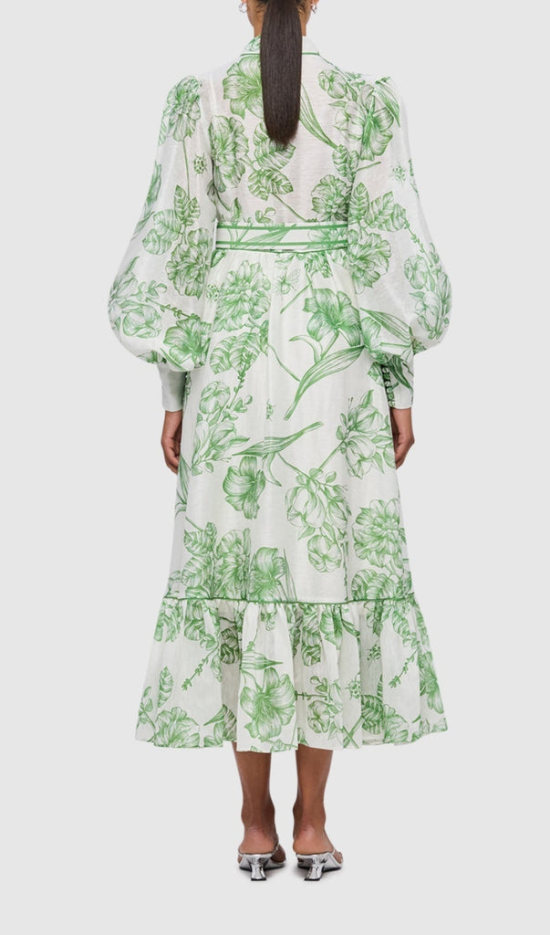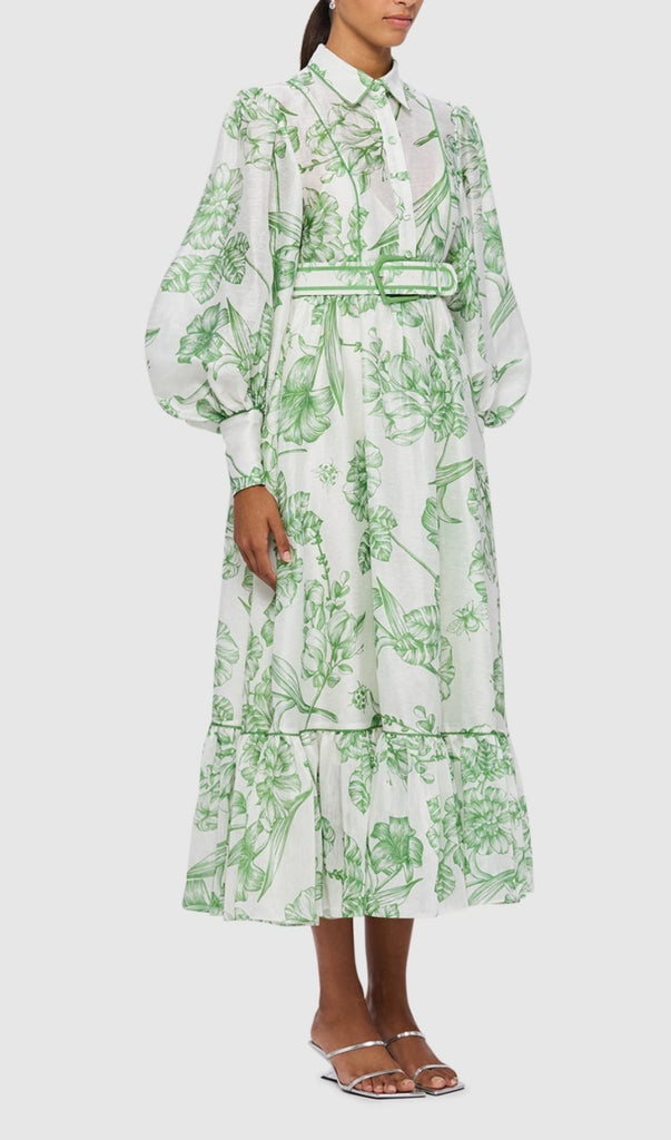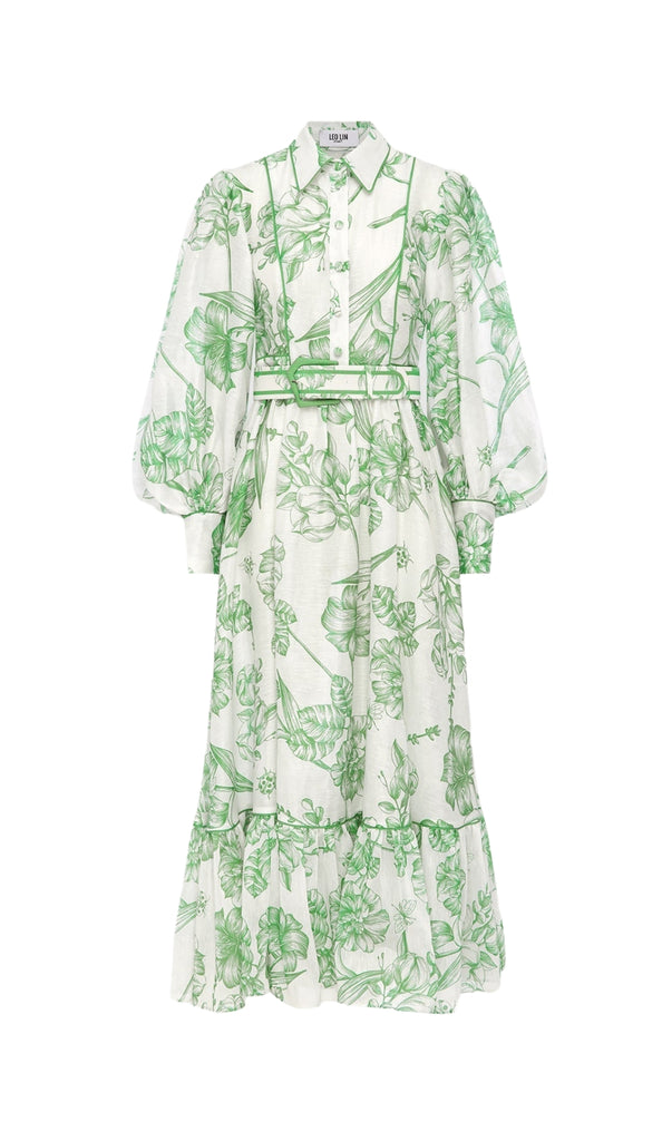 Garden party. The season’s fine botanical print – Harmony – receives a verdant expression in the Celadon colourway. The exclusive muted green and white design shapes spring-ready tea dresses, minis and full length looks ready to transport you to a secret garden.