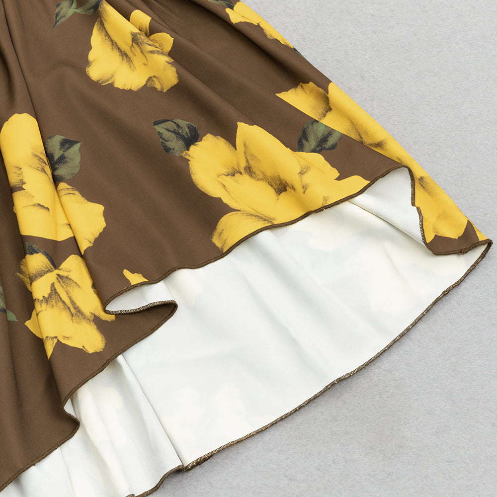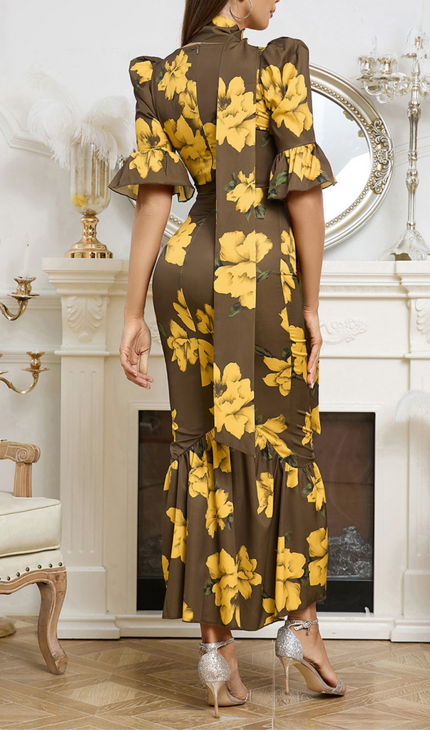 PUFF SLEEVE RETRO TUBE TOP PRINTED RUFFLE MAXI DRESS