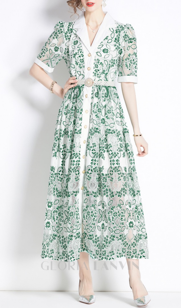 V NECK SPLICED BELTS EMBROIDERY MIDI DRESS IN GREEN