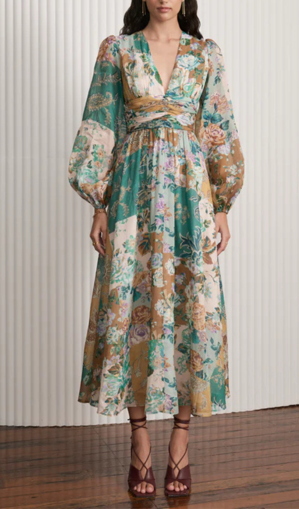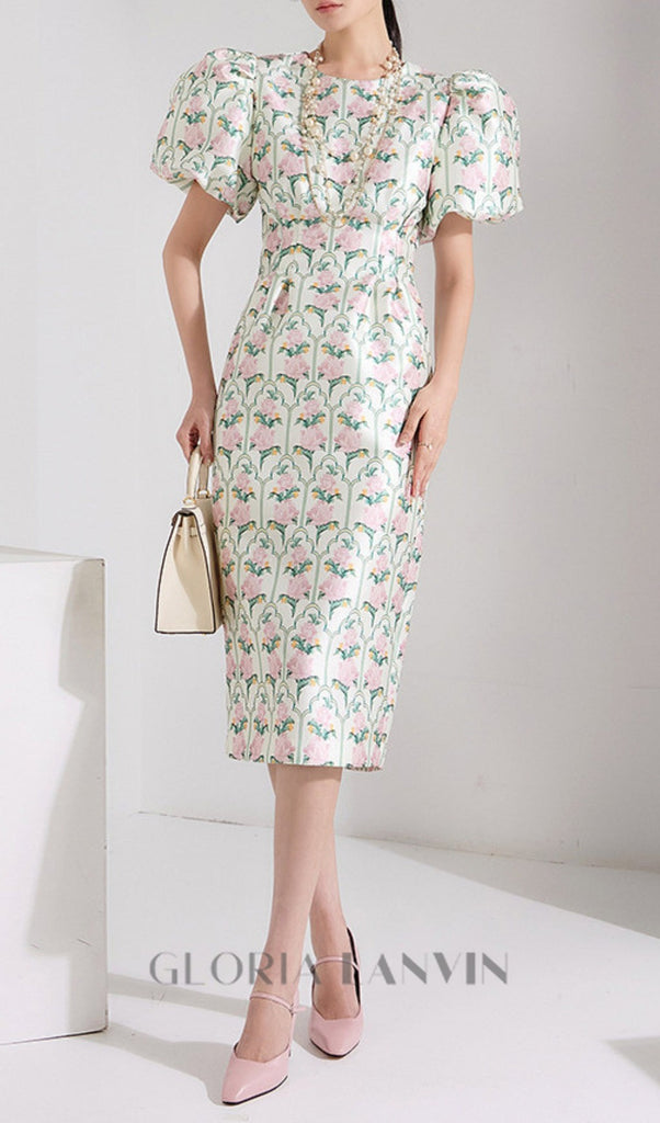PUFF-SLEEVE FLORAL PRINTED MIDI DRESS