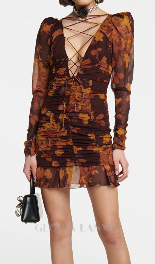 floral print hollow tulle mini dress in brown