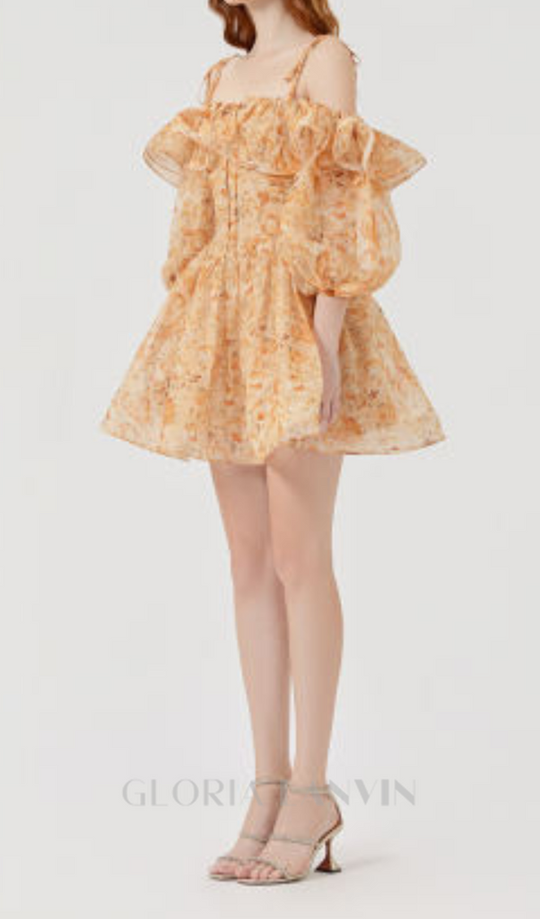 ANNA PRINTED RUFFLE TRIM MINI DRESS IN ORANGE