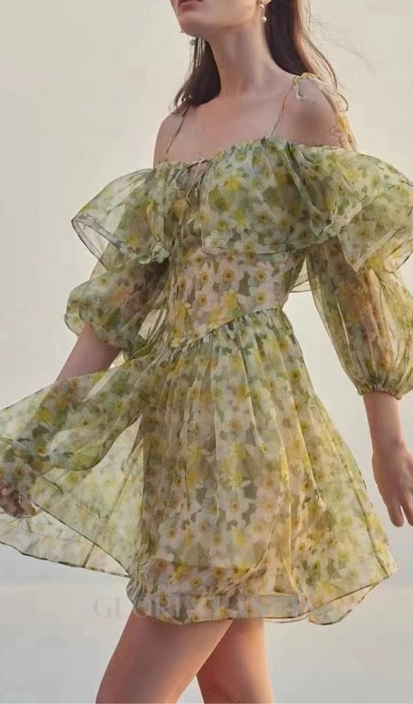 ANNA PRINTED RUFFLE TRIM MINI DRESS IN Green