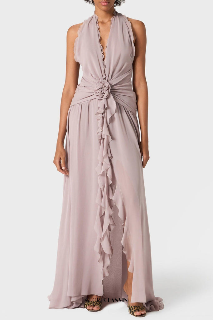 Aonaver Floral Ruffle Halter Maxi Dress in Pink