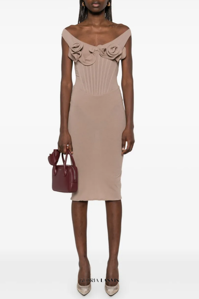 Dinella Floral Appliqué Corset Midi Dress in Grey