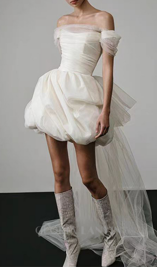 RUFFLED OFF-SHOULDER MINI SILK DRESS IN WHITE