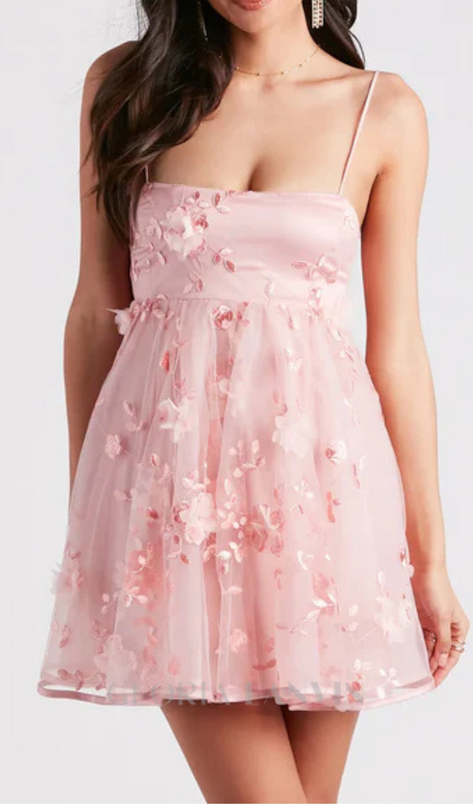 FLORAL APPLIQUÉ PLEATED HEM MINI DRESS IN PINK