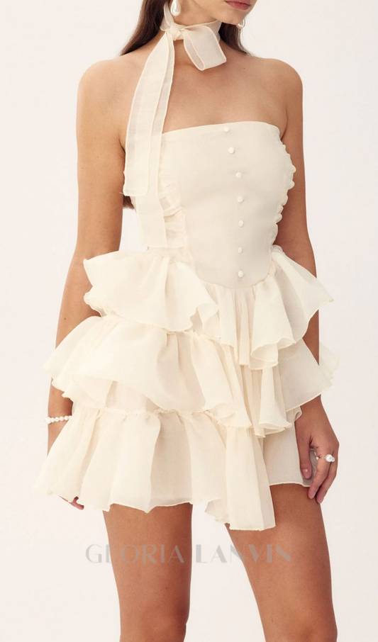 JANICE STRAPLESS RUFFLE MINI CHIFFON DRESS IN BEIGE