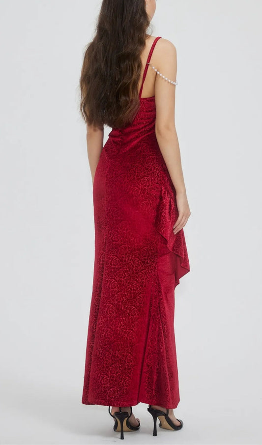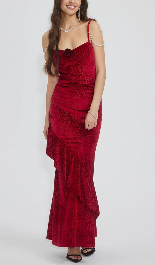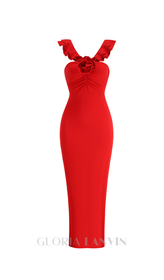 RUFFLED BODYCON SUSPENDER MAXI DRESS IN RED