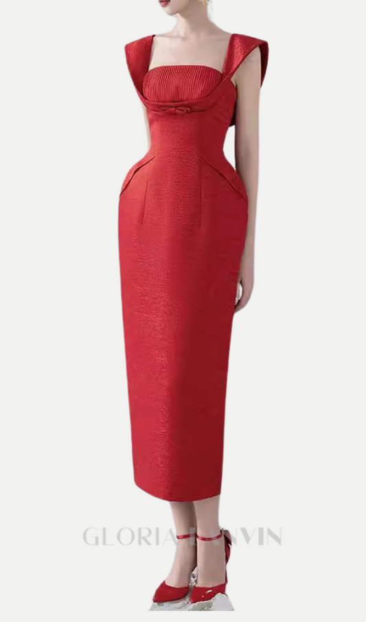 square neckline bow midi dress in red