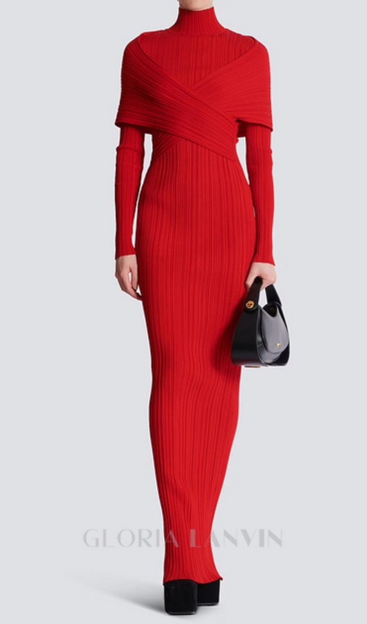 long sleeve pleated knit maxi dress in red