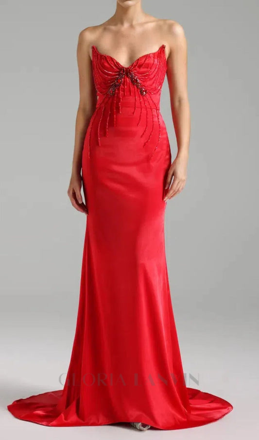 bow embellished strapless maxi dress in red