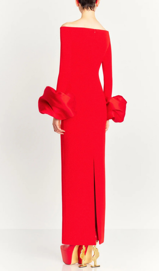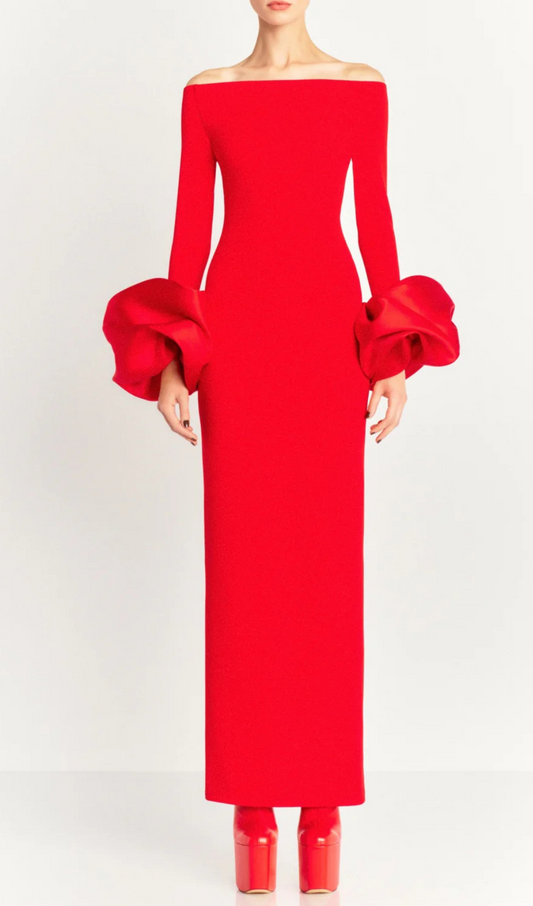 EXAGGERATED SLEEVES SLIM SEQUIN MAXI DRESS IN RED