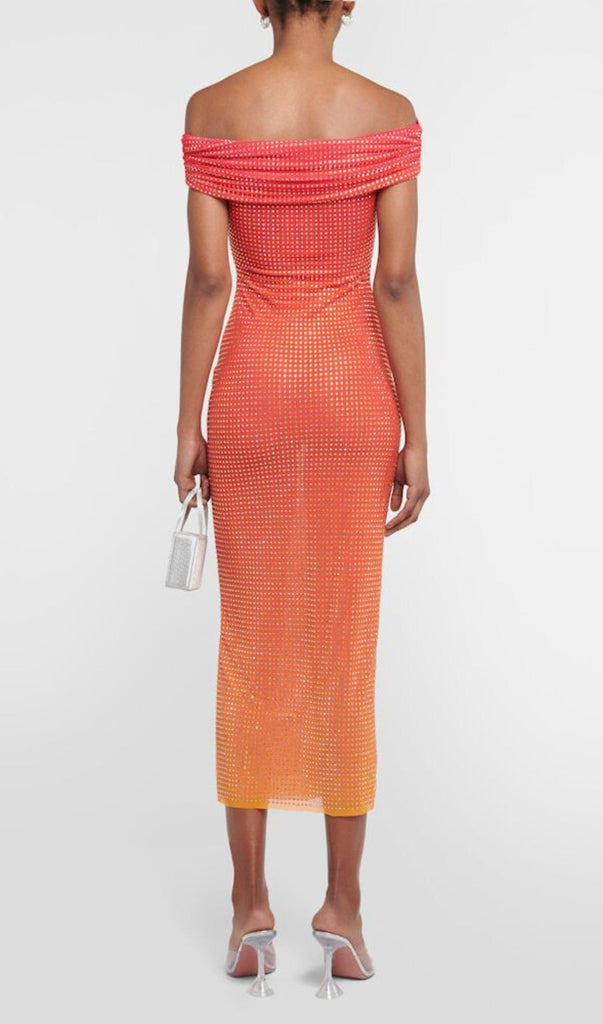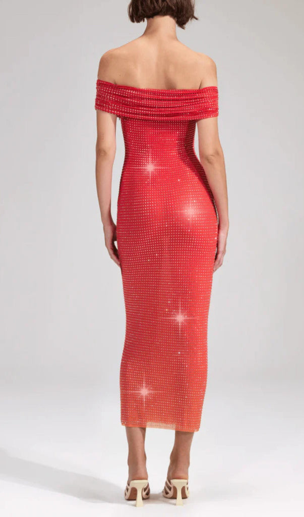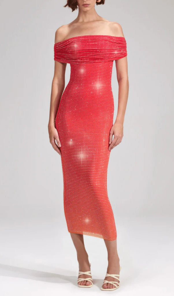 Look chic and stay comfy in this pretty pink midi dress. The off-the-shoulder neckline is embellished with a glittery design that adds extra dazzle. It's the perfect pick for a night out with the girls! (That promise a night free of drama, of course!)