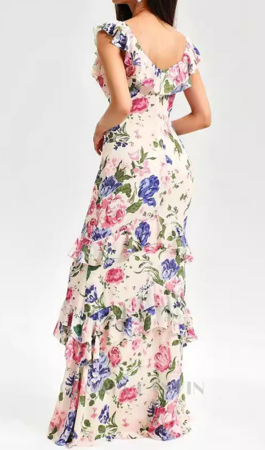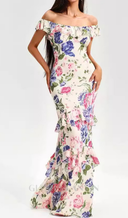 PRISCILLA MULTICOLOR OFF SHOULDER PRINT LAYERED MAXI DRESS