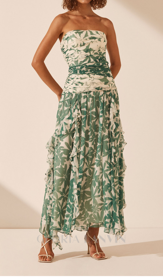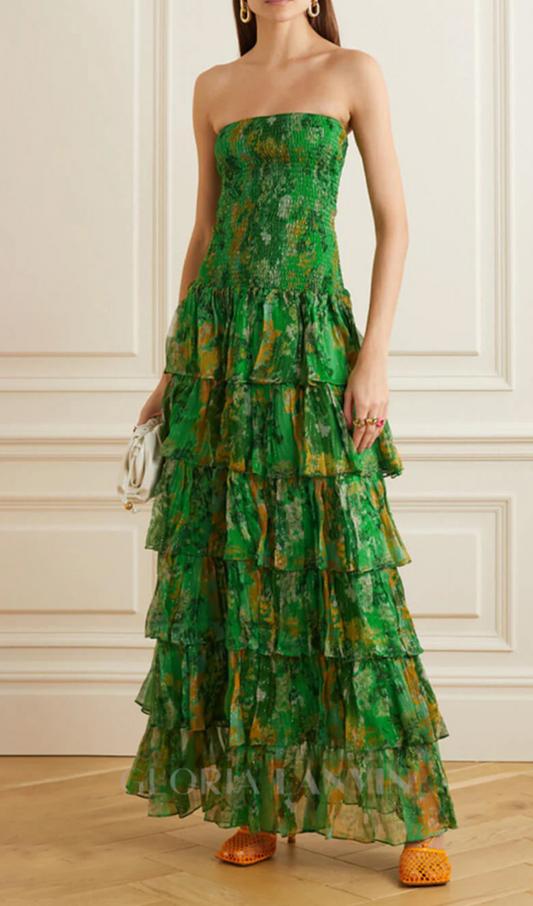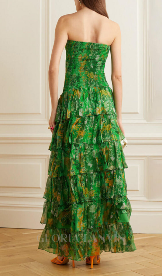 STRAPLESS LAYERED BANDEAU FLORAL PRINT MAXI DRESS IN GREEN