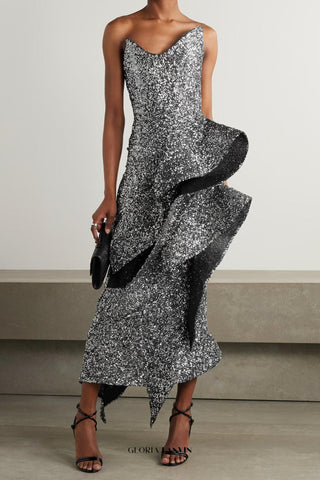 ONE SHOULDER DRAPED GLITTER BROWN CORSET OPEN BACK MAXI DRESS