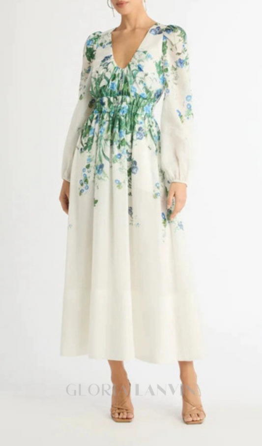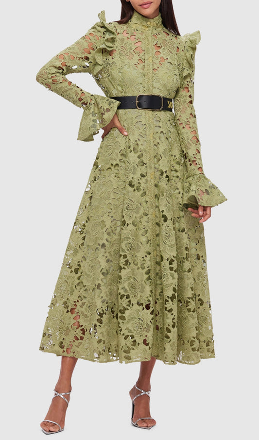 V NECK SPLICED BELTS EMBROIDERY MIDI DRESS IN GREEN