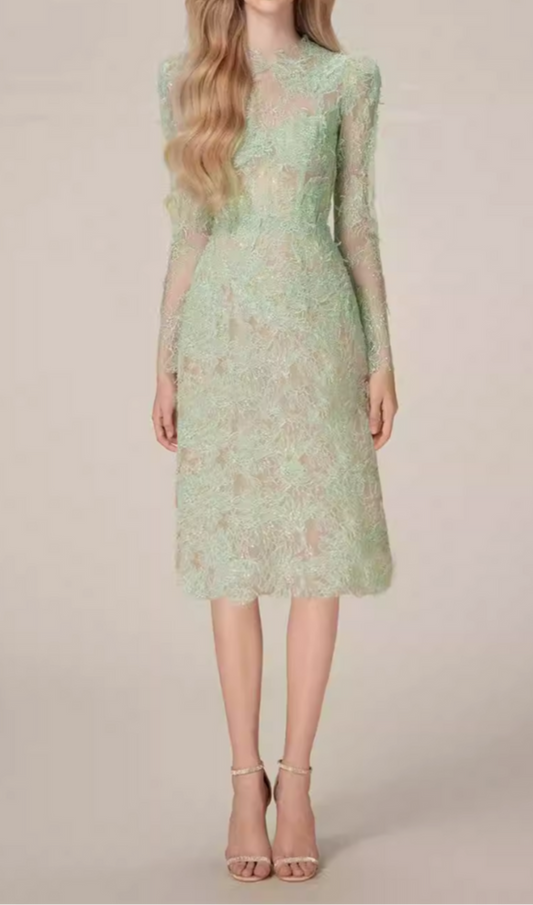 STEREOSCOPIC BUTTERFLY SEQUIN MESH MIDI DRESS IN CHAMPAGNE