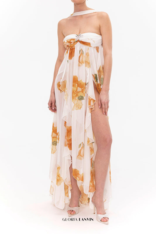norma floral print SILK ORGANZA TIE NECK MINI DRESS