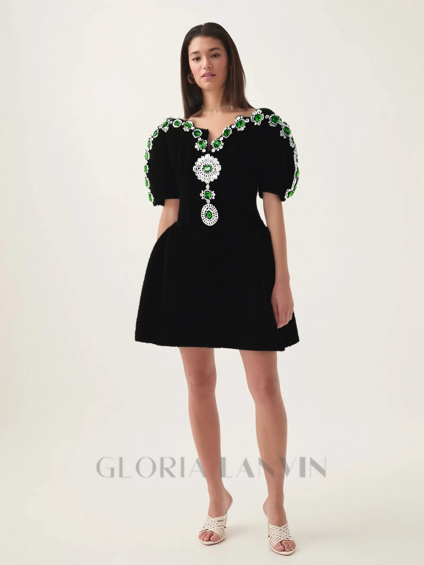 Expertly designed with crystal embellishments, this black strapless mini dress exudes elegance and sophistication. Its form-fitting silhouette enhances your figure while the strapless design adds a touch of allure. Perfect for a special occasion, this dress is sure to make you stand out.