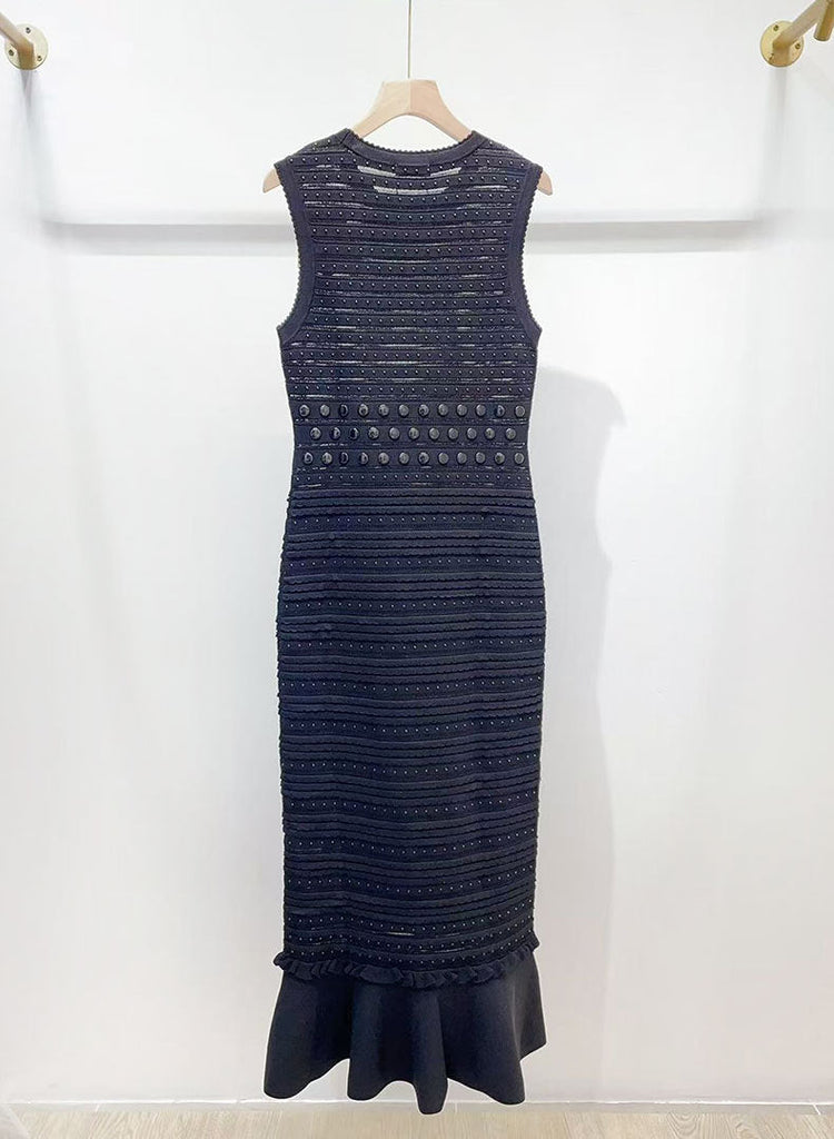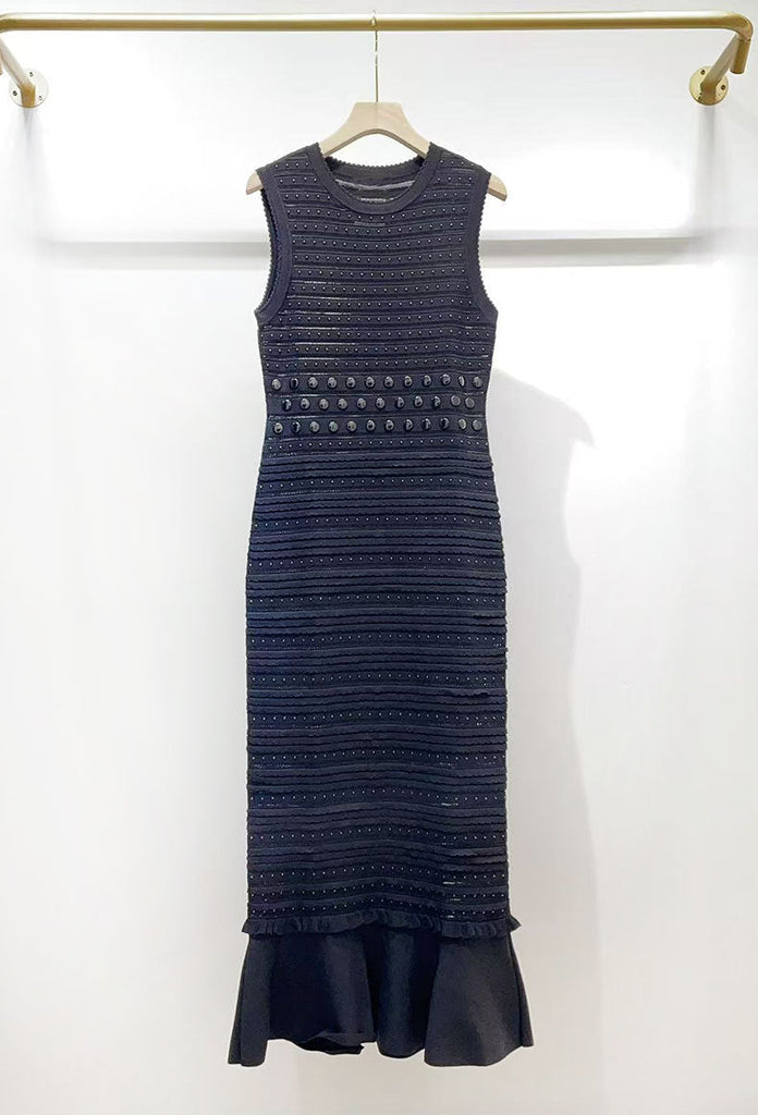 Introducing the valerie Studded Knit sleeveless Midi Dress in black, the perfect dress for any occasion. Made from high-quality knit fabric, this dress features stylish studs and a flattering sleeveless design. With its versatile midi length, it's the perfect addition to your wardrobe. Look effortlessly chic and comfortable with this dress.