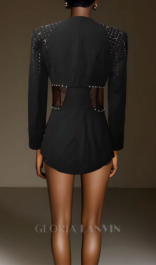 STRAPLESS JUMPSUIT LONG SLEEVE RHINESTONE BLAZER