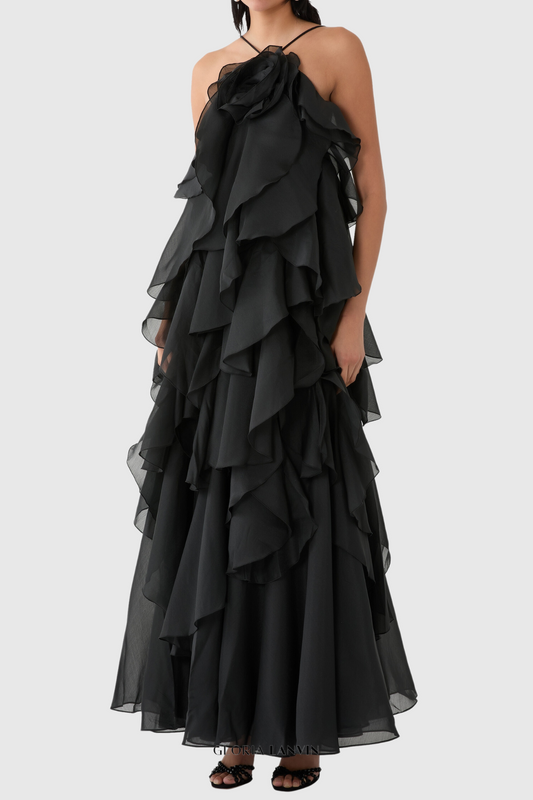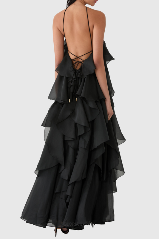 NANCY SLEEVELESS PLEATED TIERED MIDI DRESS IN BLACK