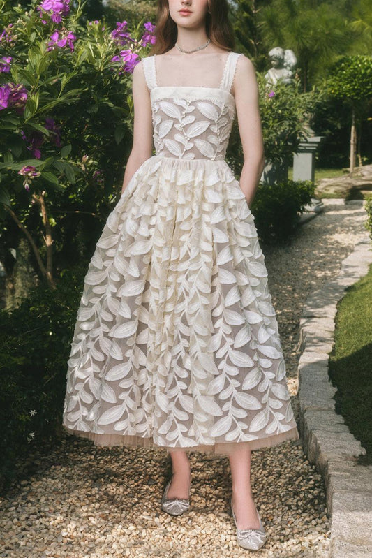 MYRA BLACK HOLLOW HOOK FLOWER A-LINE MIDI DRESS