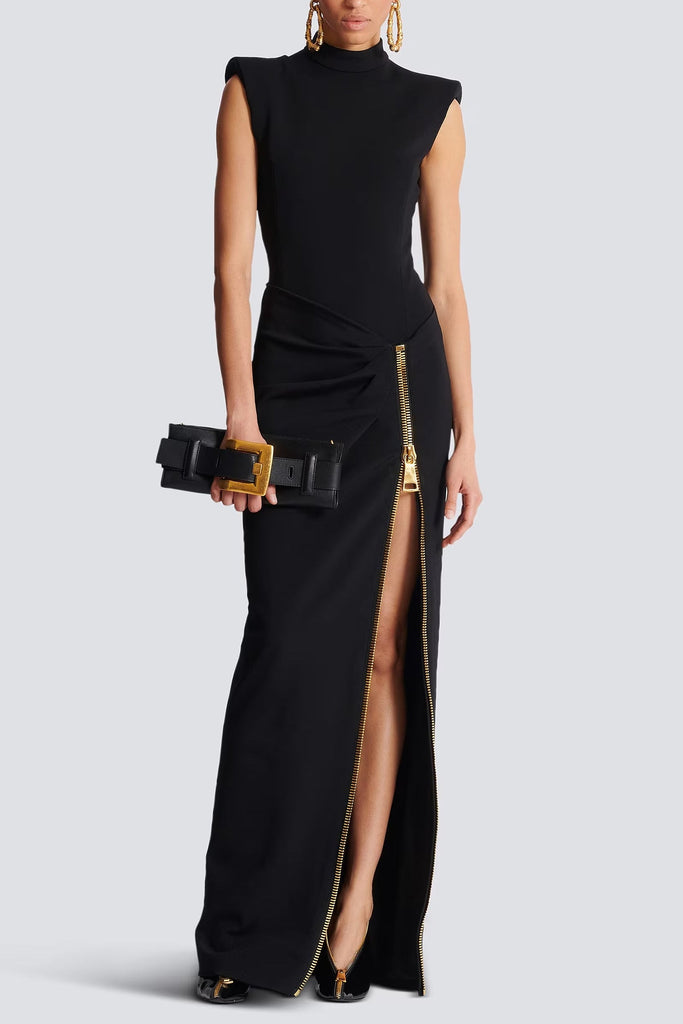 black Sleeveless Zipper high Slit Elastic jersey maxi Dress