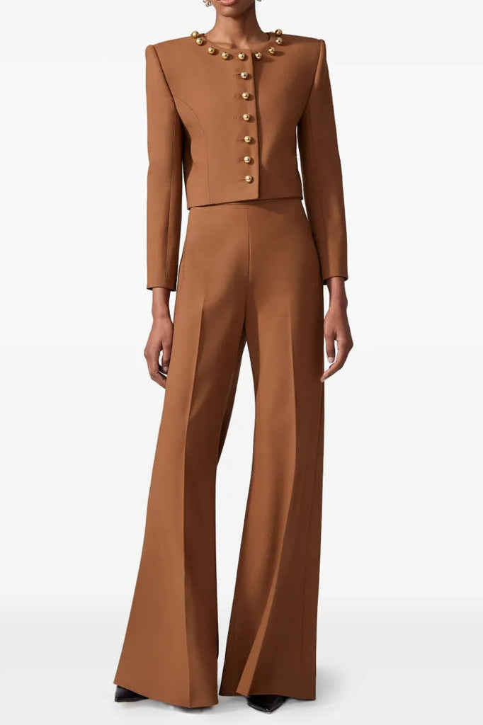 rachel black ruffled crystal-embellished crepe mock-neck gown