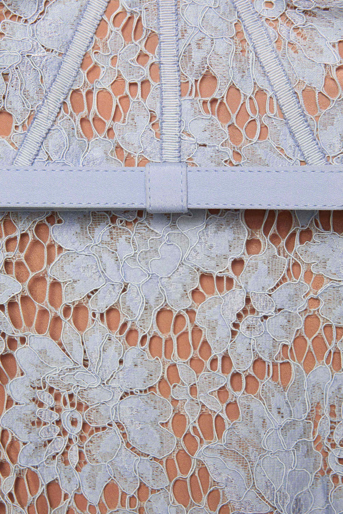 Dieses Kleid aus babyblauer Spitze ist unverkennbar feminin und verströmt elegante Ausstrahlung. Die raffinierten Details an den Brustkörbchen und der Gürtel mit Schleifenmotiv machen es zum perfekten Accessoire für Ihren nächsten exklusiven Anlass – kombinieren Sie es mit auffälligen High Heels.
