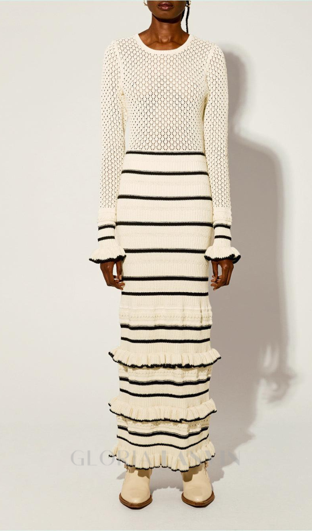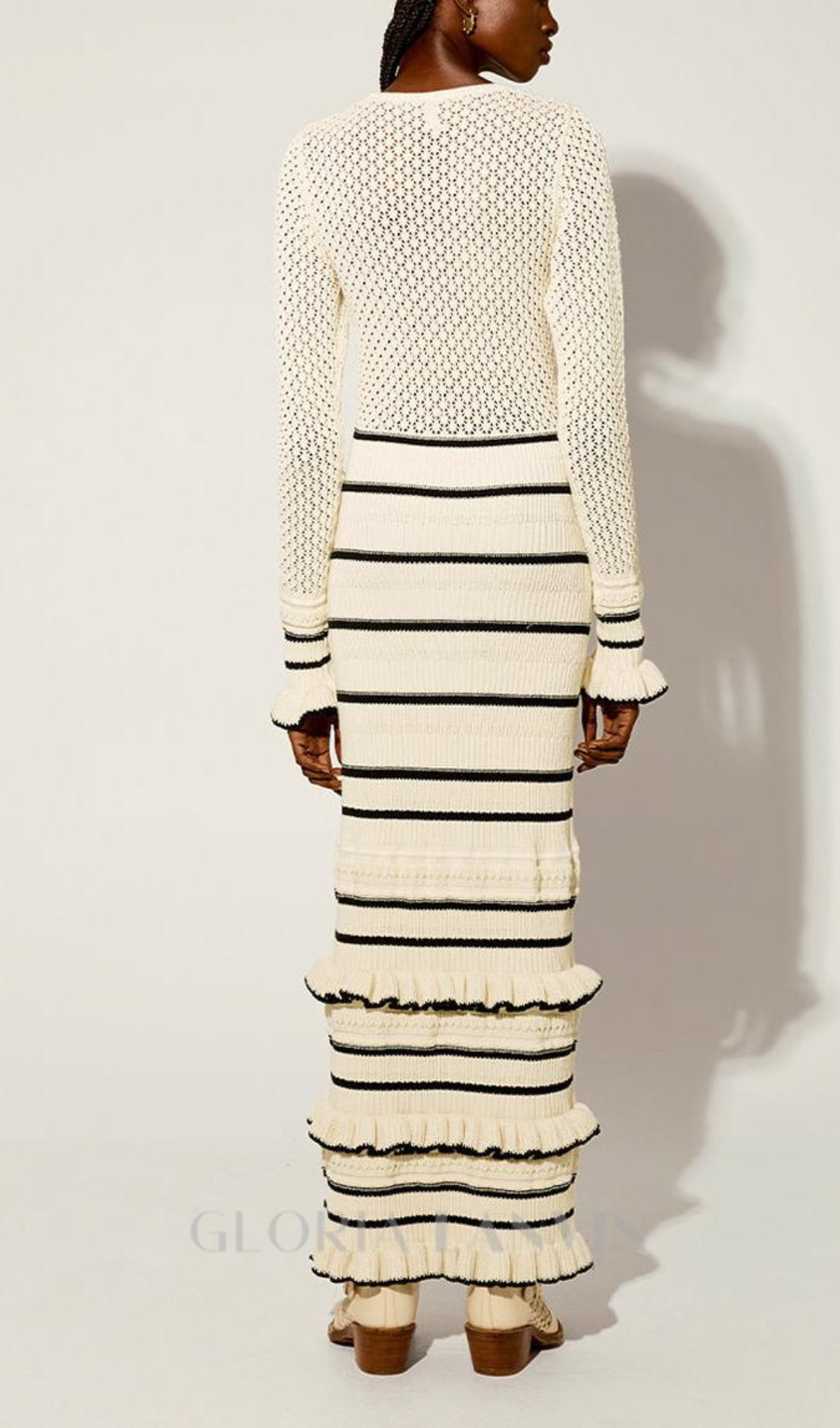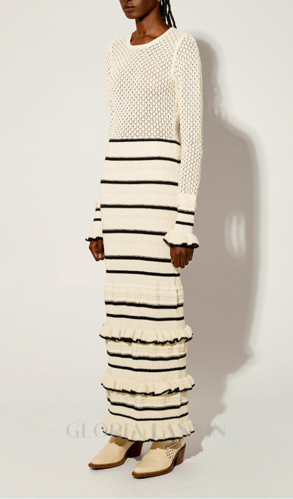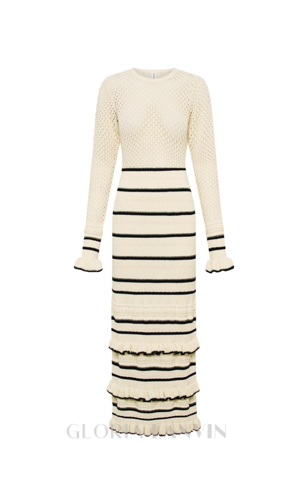 Dieses Kleid aus hochwertigem Strickstoff vereint Komfort und Stil mit seiner eleganten Midi-Länge und dem markanten Streifenmuster. Die Rüschen verleihen ihm eine feminine Note und machen es zur perfekten Wahl für jeden Anlass.