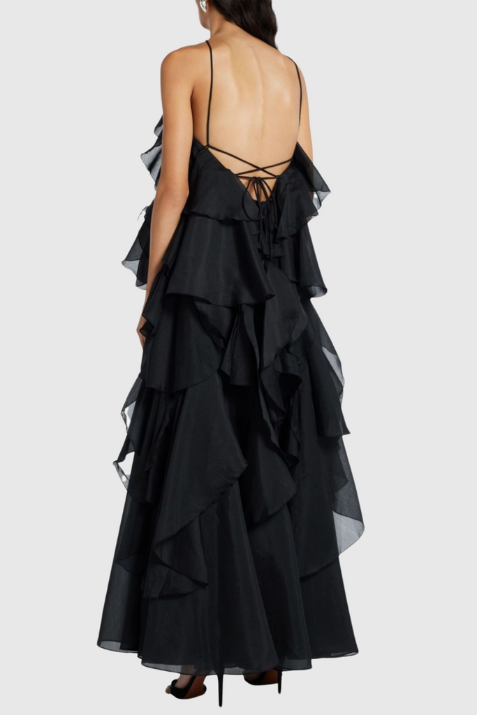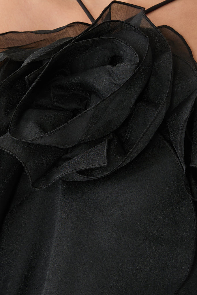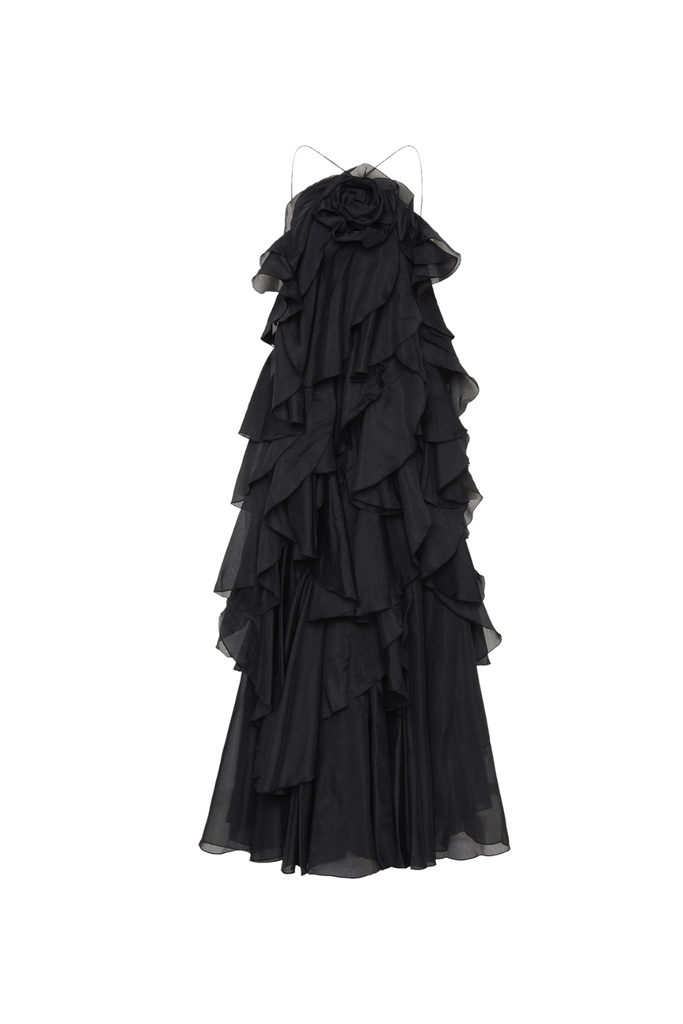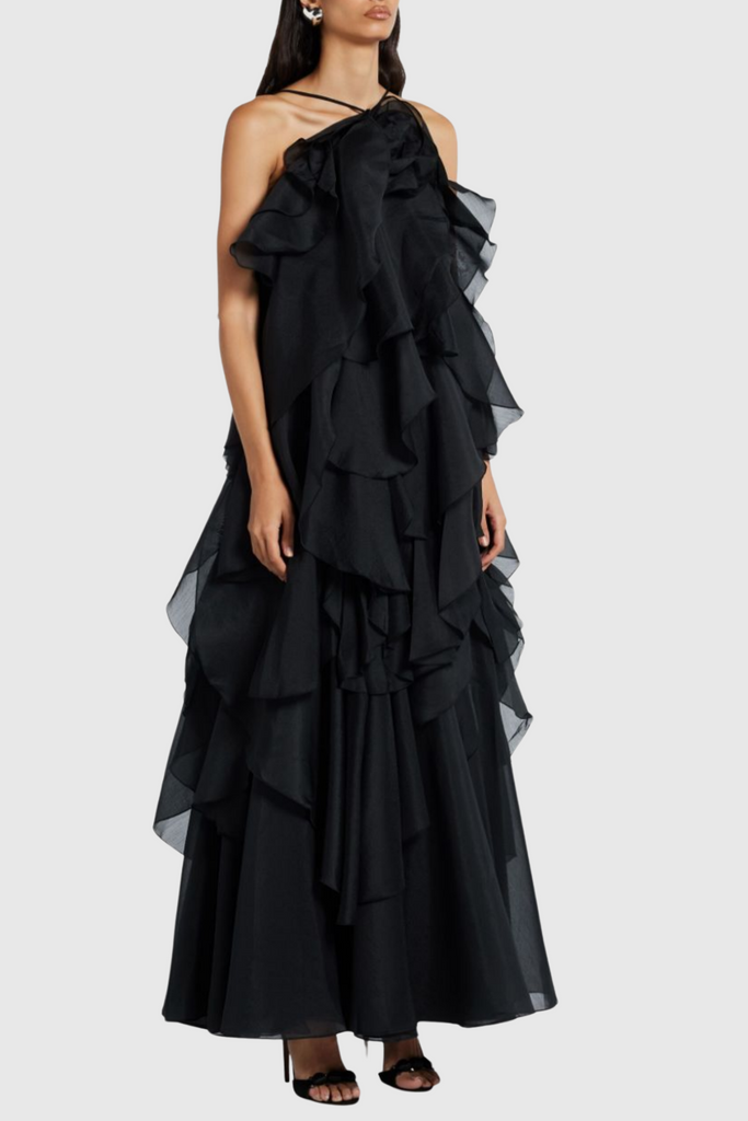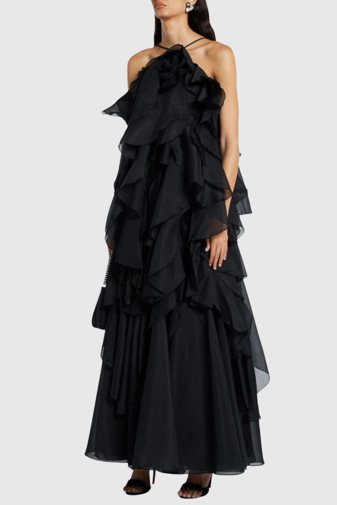 Schwarzes Caysie Neckholder-Maxikleid mit floralen Rüschen und Lagenlo – Gloria Lanvin