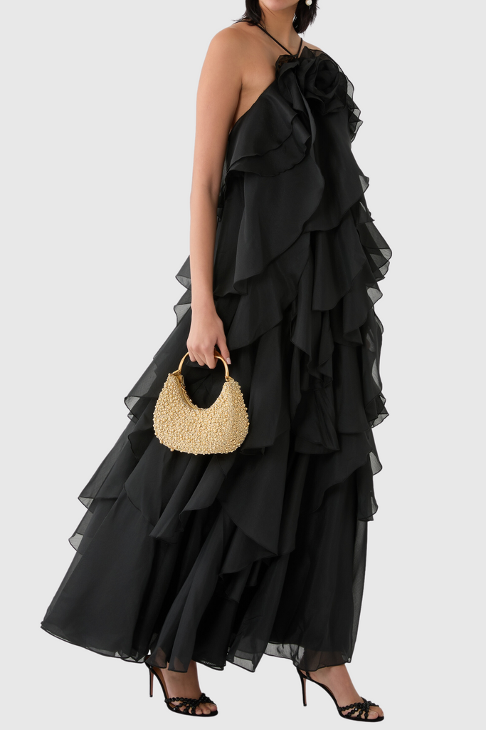Schwarzes Caysie Neckholder-Maxikleid mit floralen Rüschen und Lagenlook
