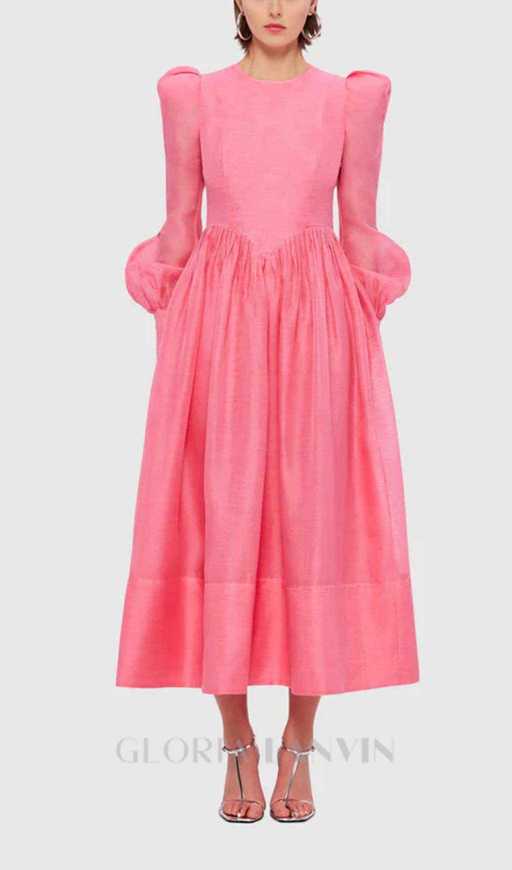 DELIA MIDI-KLEID MIT ROSAFARBENEN LATERNÄRMELN UND RUNDHALSAUSSCHNITT