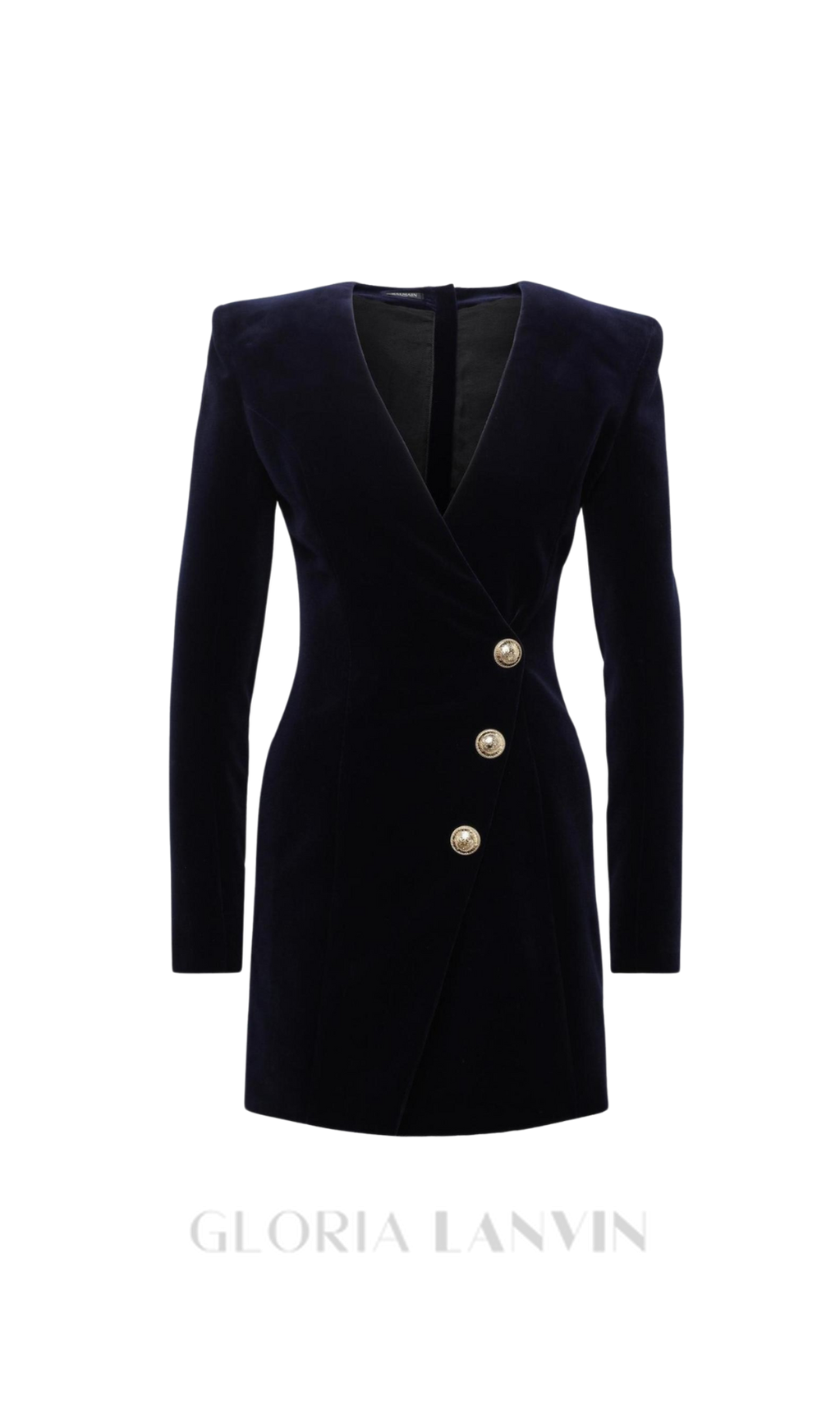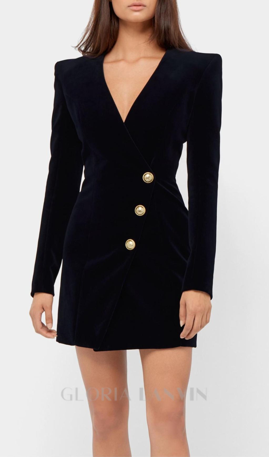 HEDDA MINIKLEID AUS SCHWARZEM SAMT MIT V-AUSSCHNITT UND METALLKNÖPFEN
