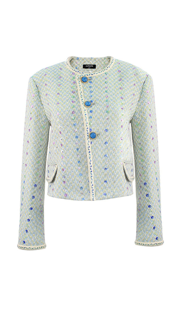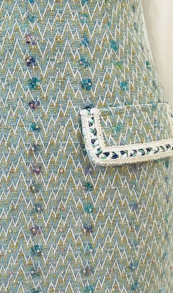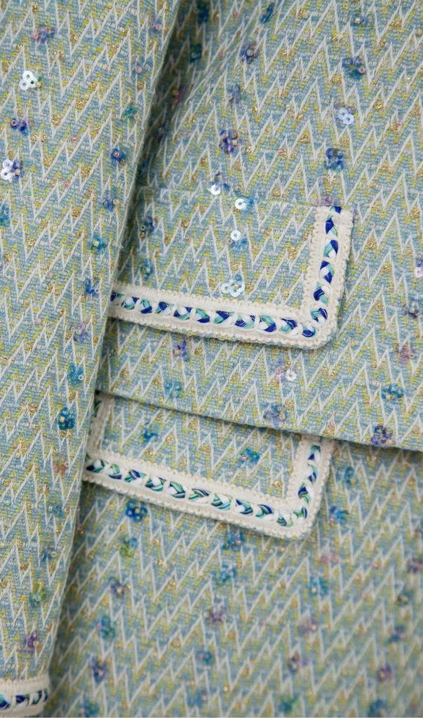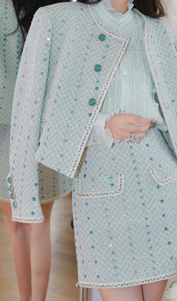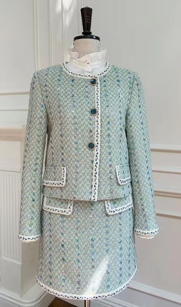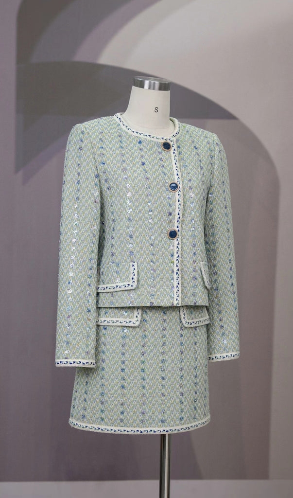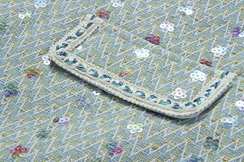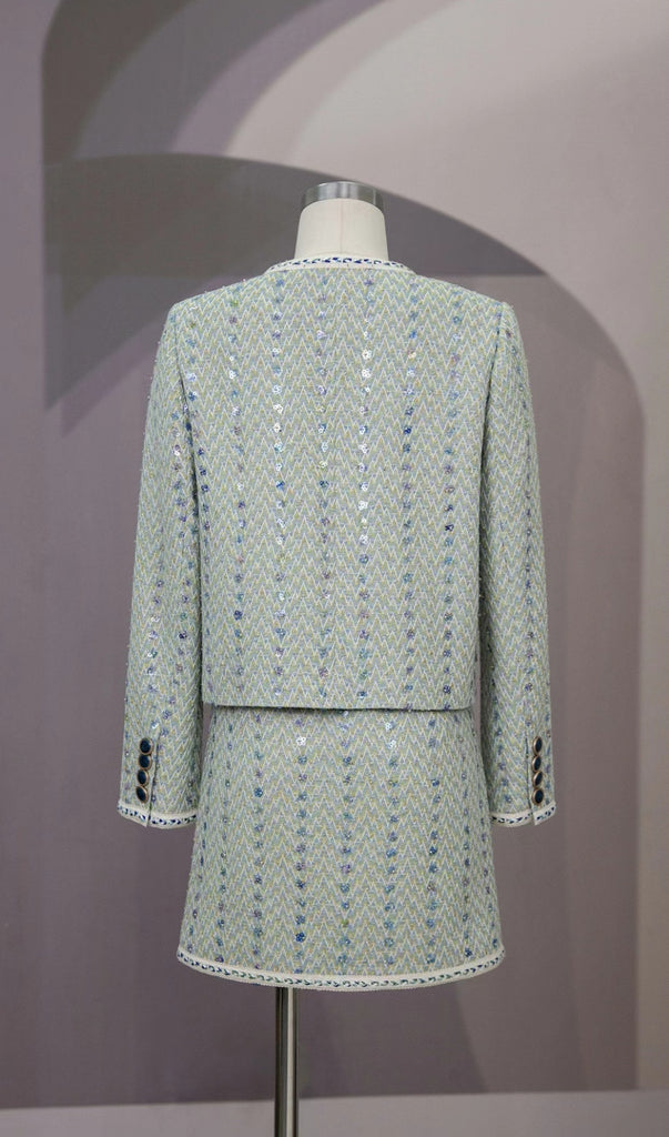 Dieses Set ist ein wahrgewordener Traum für Fashionistas! Mit einer Jacke und einem Rock im Small Fragrant Style mit schwerer Paillettenstickerei setzen Sie überall ein Statement. Mit umwerfendem Stil und unerwartetem Flair ist dieses Set ein Muss für jede Garderobe. Machen Sie sich bereit zu funkeln!