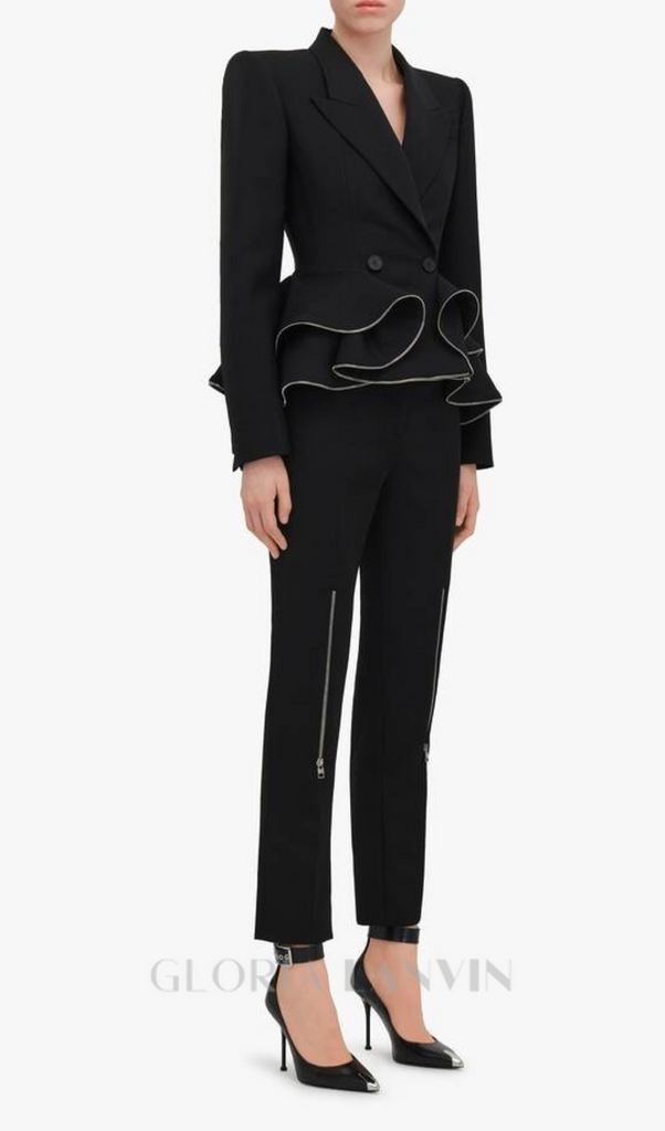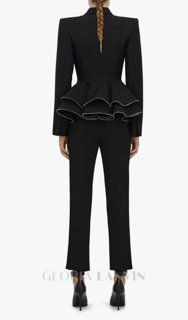 Dieses stilvolle und elegante Set besteht aus einem taillierten Blazer mit schmeichelhaftem Schößchen und doppelreihiger Knopfleiste für einen souveränen Auftritt. Perfekt, um im Meetingraum oder bei besonderen Anlässen ein Statement zu setzen. Bereichern Sie Ihre Garderobe noch heute!