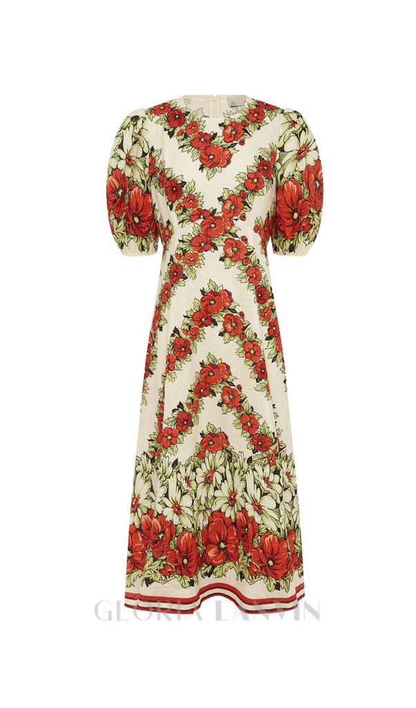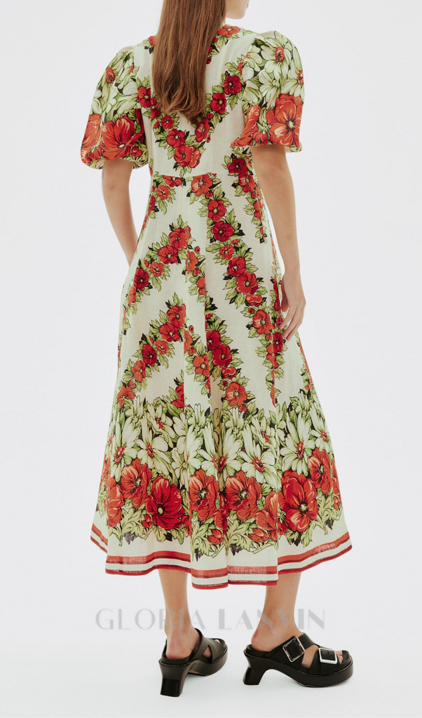 Der lebendige Blumendruck verleiht dem Kleid einen Hauch Romantik, während die Midi-Länge Eleganz ausstrahlt. Gefertigt aus hochwertigen Materialien, bereichert dieses Kleid Ihre Garderobe mit seinem luxuriösen Stil. Perfekt für jeden Anlass.