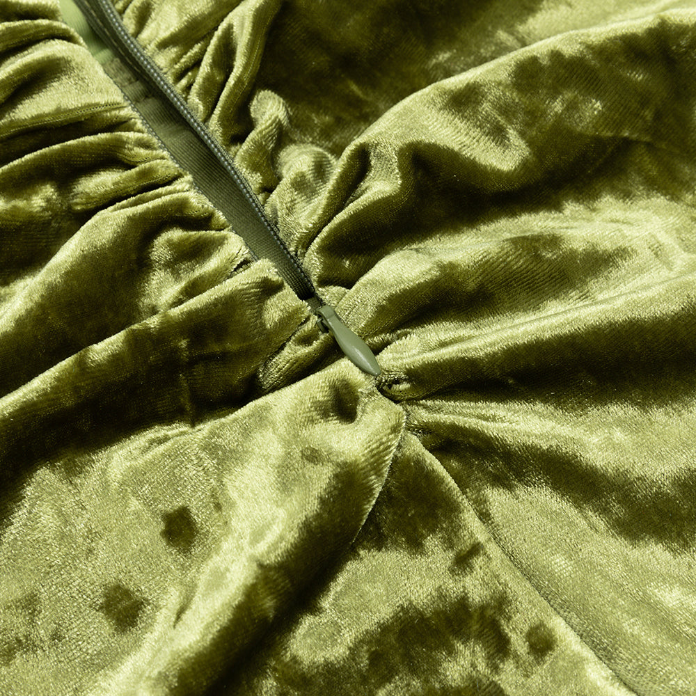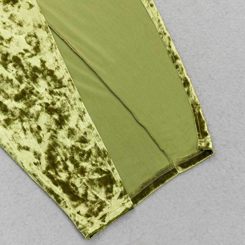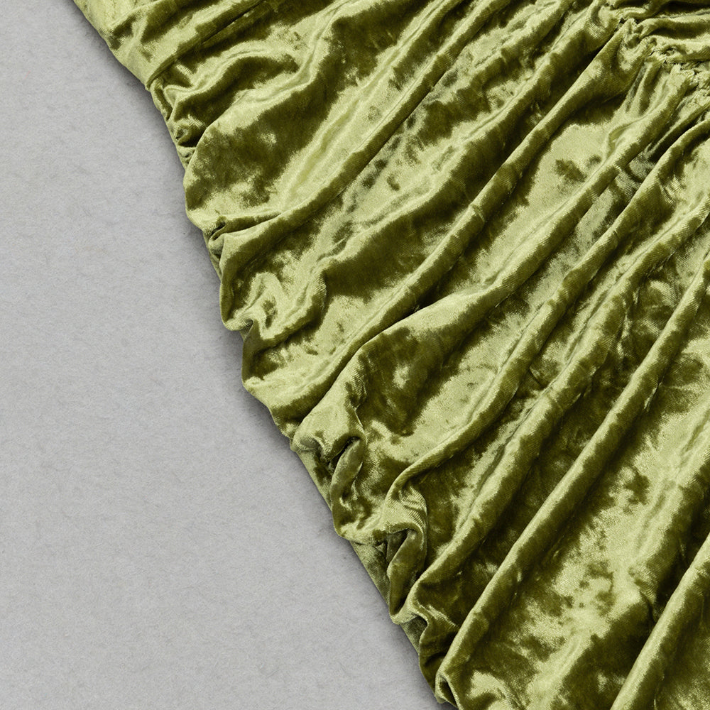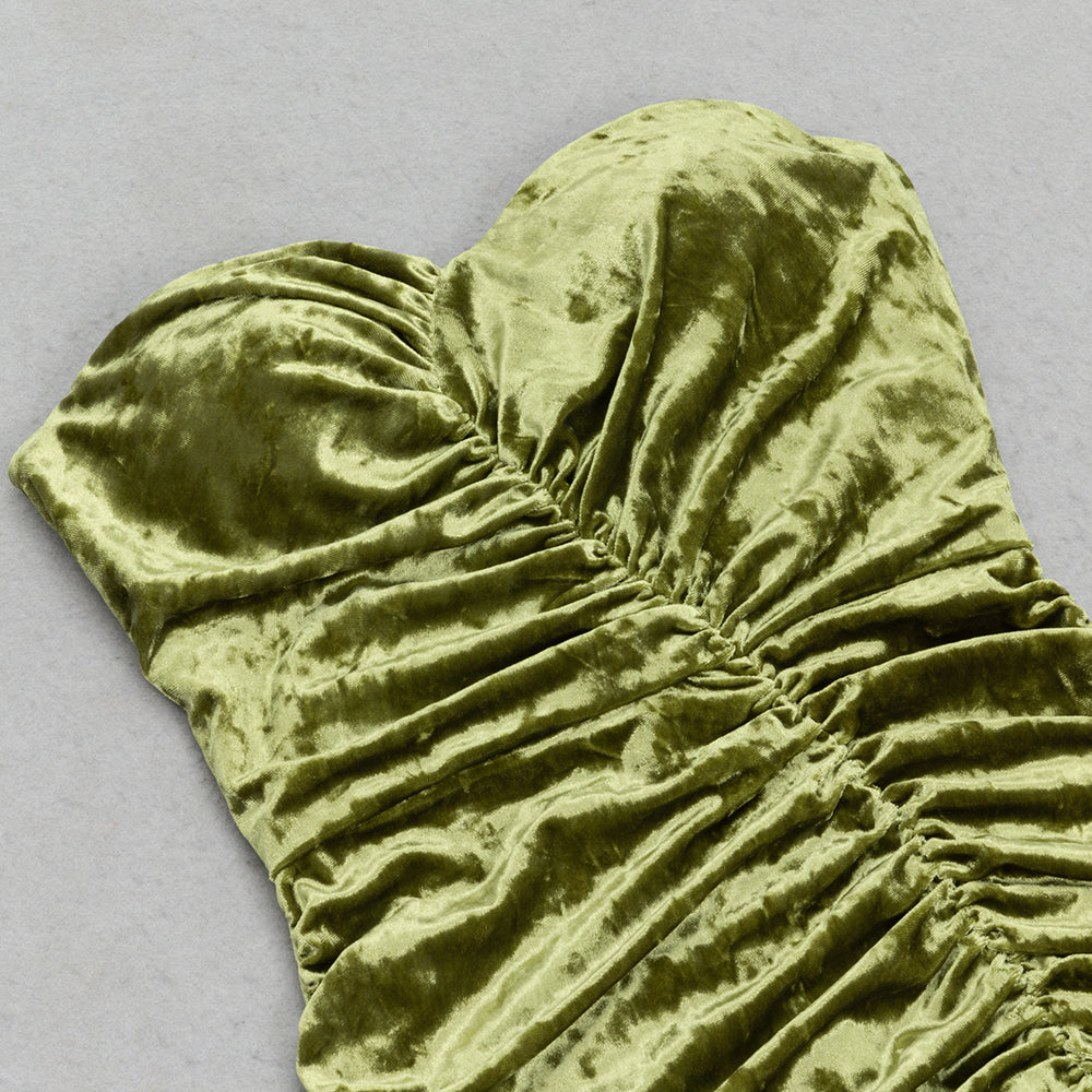 GRÜNES MIDIKLEID AUS SAMT MIT V-AUSSCHNITT, PLISSIERTEM TUBE-TOP UND HOHER SCHLITZ
