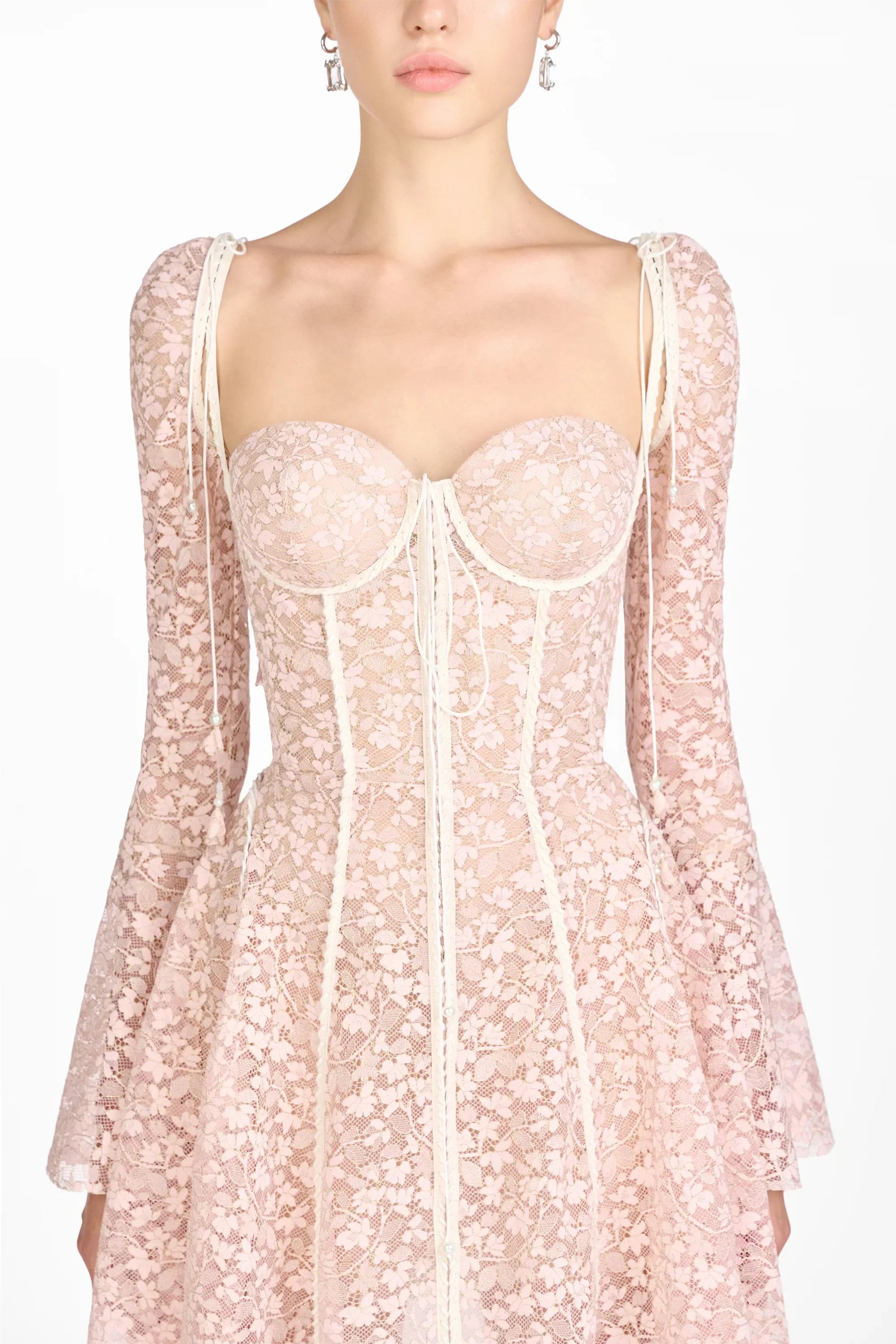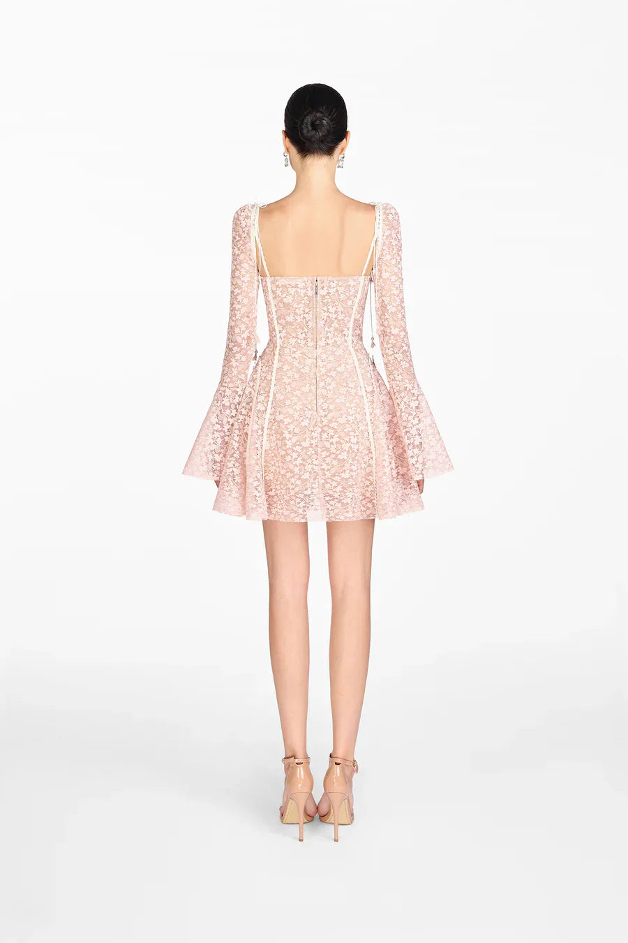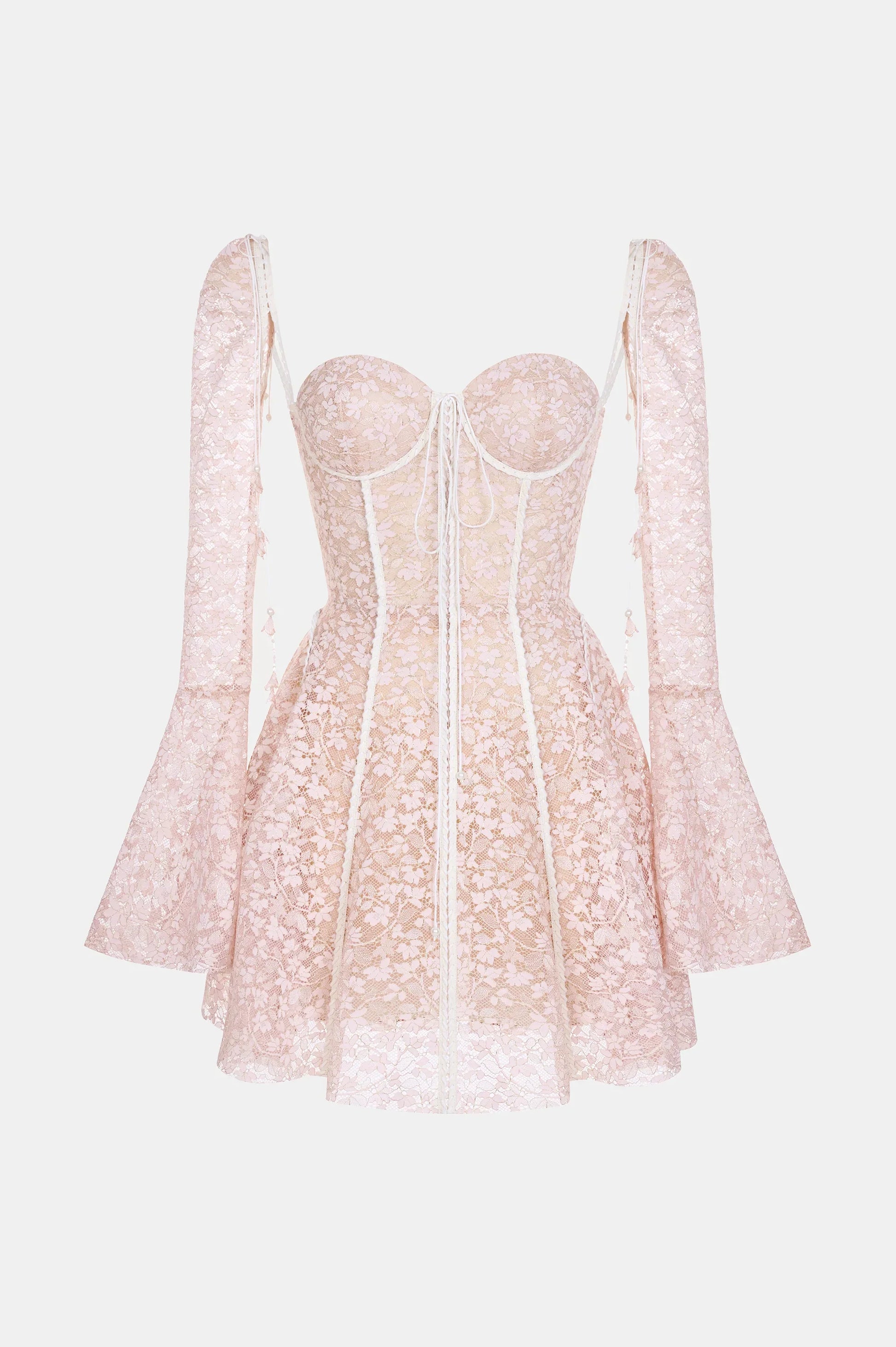 Fangen Sie die Essenz zeitloser Romantik mit dem Spitzenkleid „Romance“ ein, einem bezaubernden Minikleid für die moderne und zugleich klassische Frau. Dieses elegante Kleid besticht durch seine schmeichelhafte A-Linien-Silhouette, ein Bustier-Oberteil und lange Ärmel aus Spitze und vereint so auf perfekte Weise Raffinesse und Charme. Die neutrale Roséfarbe verleiht ihm einen Hauch dezenter Eleganz und macht es zur idealen Wahl für verschiedenste Anlässe.