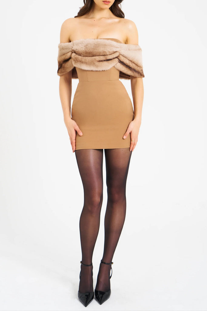 Kurkuma-Minikleid mit schulterfreiem Pelzbesatz