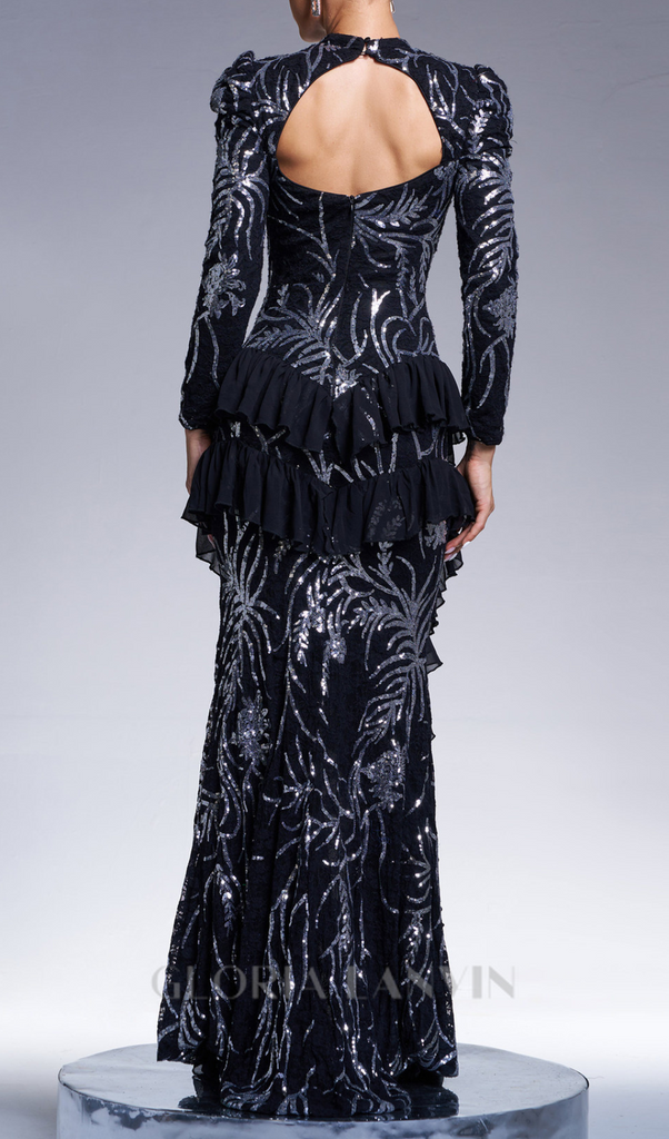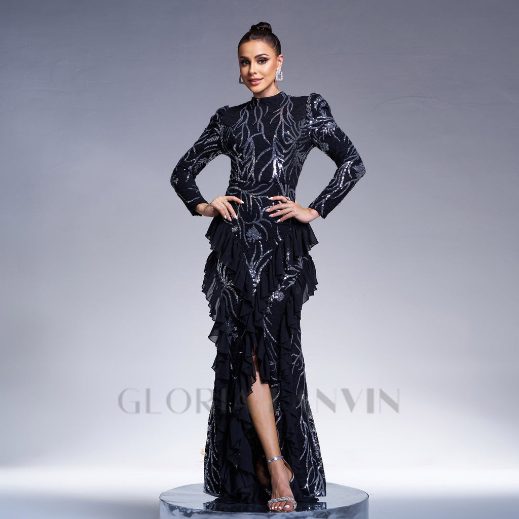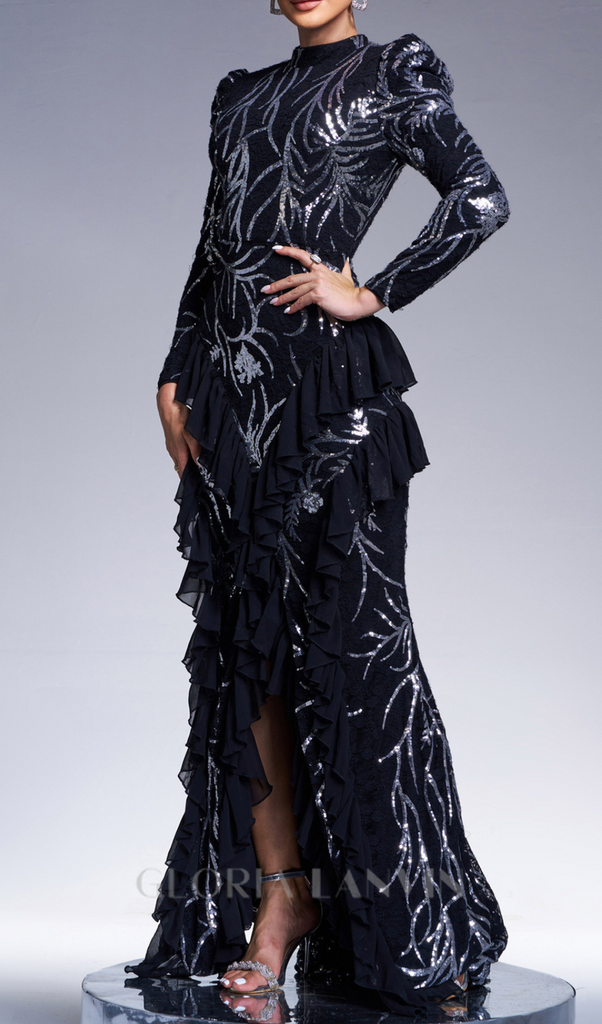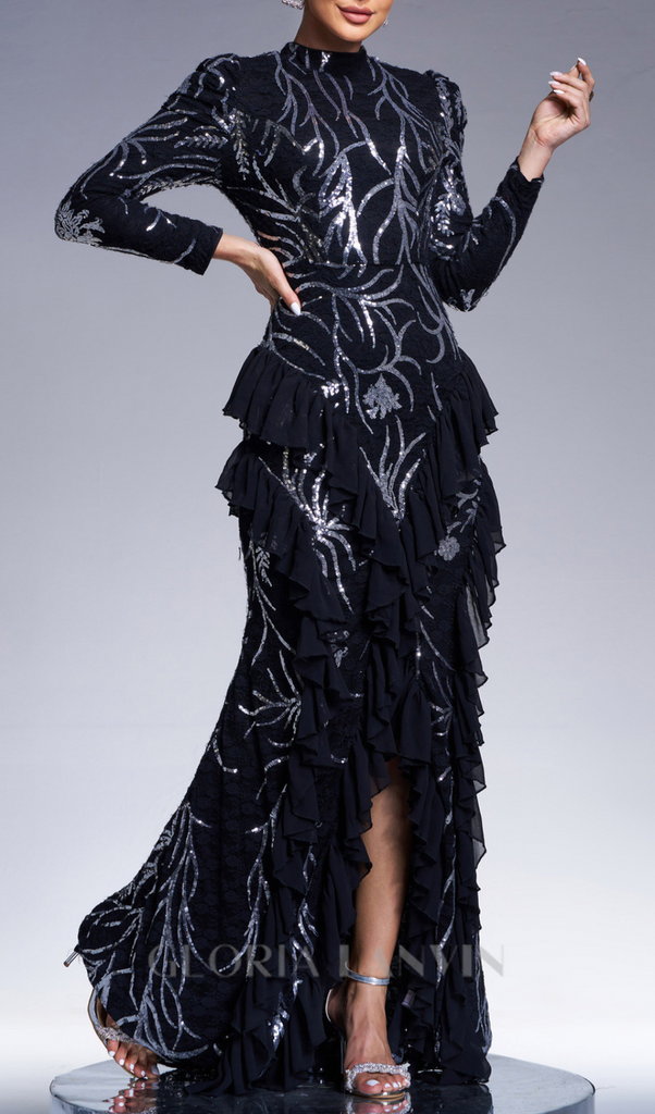 Strahlend schön in diesem ausgefallenen schwarzen Maxikleid mit Rüschenbesatz und Paillettenmuster! Setzen Sie ein modisches Statement und tanzen Sie die ganze Nacht durch.