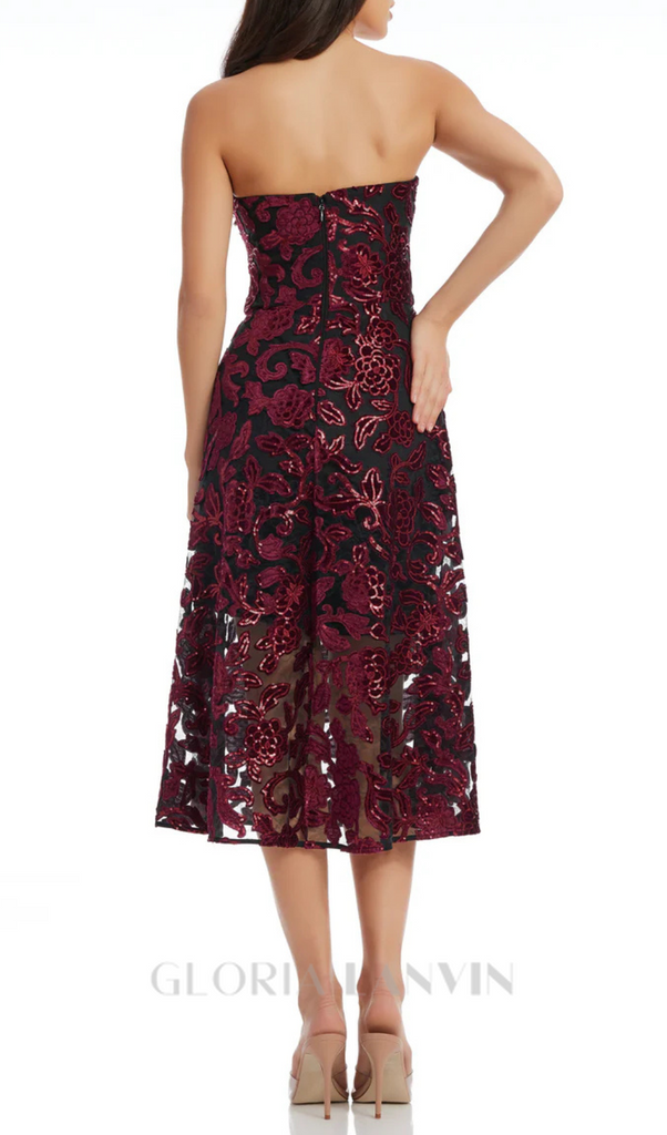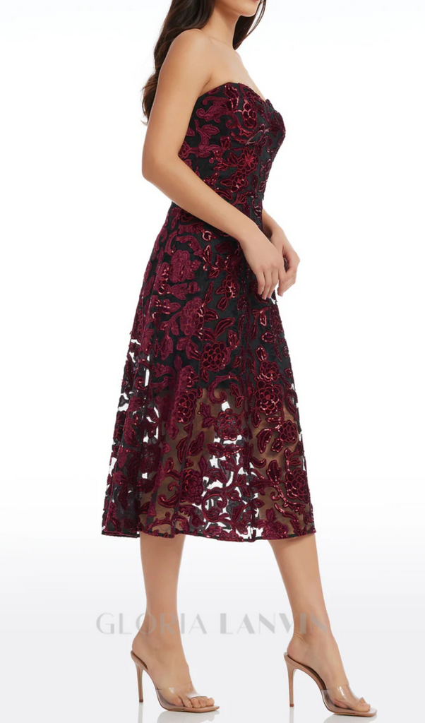 trägerloses Midikleid mit Blumenmuster in Burgunderrot – Gloria Lanvin